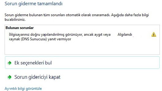 Windows 7-8-10 ağ bağdaştırıcı sorun giderici ekranında karşılaşılan Algılandı! DNS sunucusu yanıt vermiyor sorununu aşağıdaki adımları uygulayarak giderebilirsiniz. İnternet bağlantısı kurma konusunda sorun yaşadığınız zaman otomatik olarak devreye girek sorun giderici araçlar ile, internet bağlantı sorunları giderilebilir fakat bazı durumlarda bu araç yetersiz kalabiliyor. En azından sorunun tespiti açısından bilgi alsanız da sorun giderme noktasında yetersiz kalabiliyor.