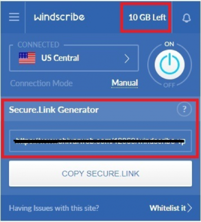 Kurulumdan sonra Windiddiew tarayıcı uzantısı gerçekten basit görünüyor ve sorunsuz çalışıyor. Tarayıcıda Windscribe simgesini tıkladığınızda, çok basit bir kontrol paneli gösterir. Panel, ne kadar GB kaldığını ortaya koyuyor. Secure.link jeneratörünün kullanımı da çok kolaydır.